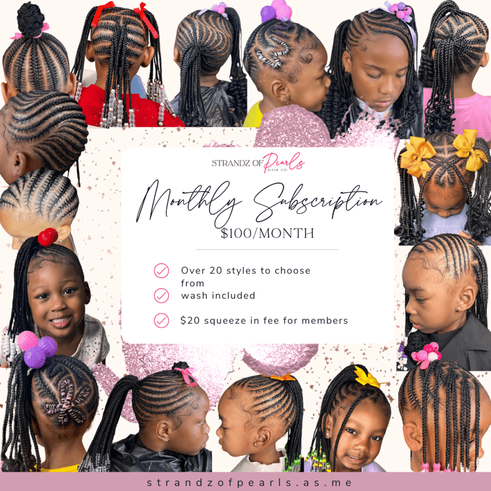 Did you know that Strandz of Pearls offers kids monthly subscriptions? It a great way for us to hour your loyalty to us by helping you save money on your child's monthly service. For $100/monthly you can choose from 20+ styles and have a wash included in every appointment. To get started with your monthly membership today just click the button below.